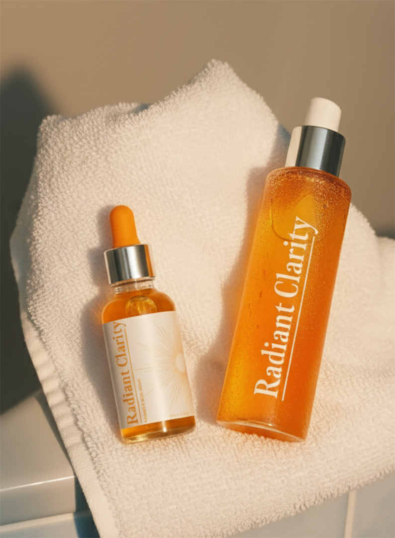 Radiant Clarity started as a simple idea: a clean, modern skincare product with a soft, natural glow. I designed the entire label myself, and then expanded that into a full art direction using AI to generate the scenes, models, and overall atmosphere.